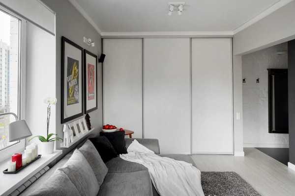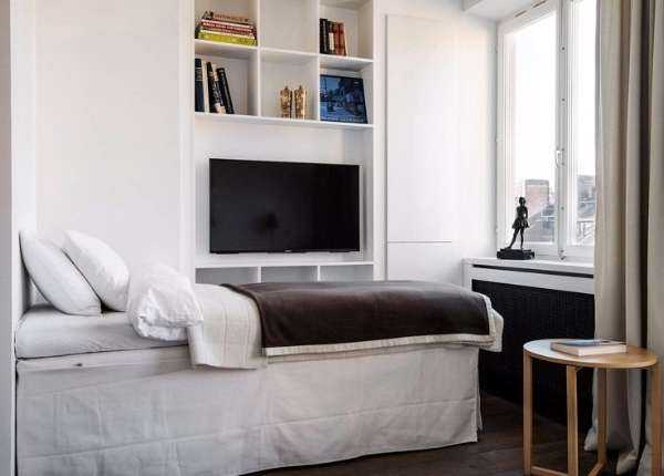 Рассмотрим дизайн интерьера маленькой квартиры студии в стиле минимализм, выполненной в модном сочетании белого и серого цветов. Спальное место располагается в непосредственной близости с телевизором, а также полками, встроенными в стену. Напротив кровати находится окно, которое хорошо освещает зону спальни.