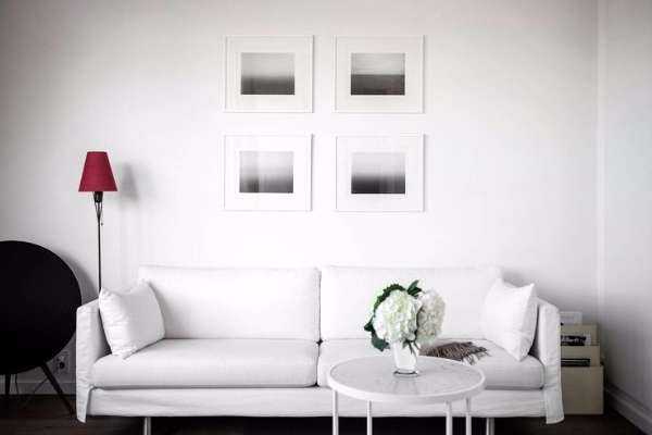 В другой стороне комнаты красуется зона отдыха, где размещен белый диван и контрастное черное кресло. Своеобразным декором в минималистическом стиле являются четыре квадрата, размещенных над диваном.