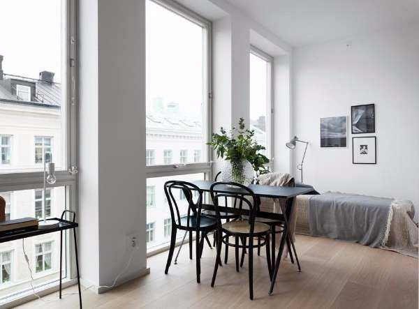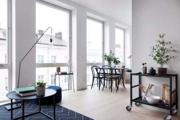 В дизайне маленькой квартиры студии в скандинавском стиле сразу бросаются в глаза большие окна, являющиеся изюминкой данного помещения. Гостиная обустроена диваном с маленьким столиком и отделена от остального пространства уютным ковром. Оригинальный торшер акцентирует на себе внимание.