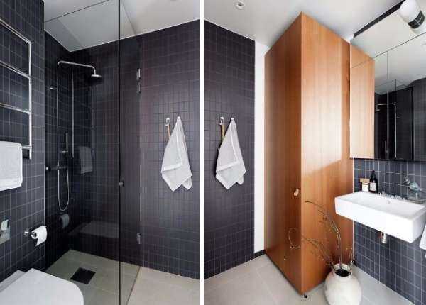 Зонирование обеспечивается благодаря применению различных материалов и цветовых решений. Отделочный материал для стен, пола и потолка может существенно отличаться в каждой зоне. Кроме того, можно добавить стеклянные перегородки, которые не будут занимать много места и при этом справятся с возложенными функциями.
