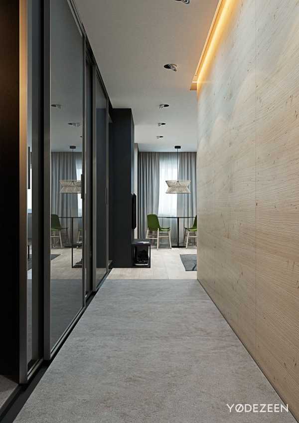 Помещение оформлено в холодных, темных тонах, что визуально уменьшает пространство.