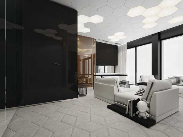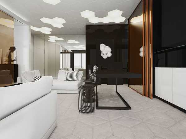 Эта квартира разительно отличается от тех проектов, с которыми мы познакомились раньше. Её эстетика базируется на присутствии ультрасовременных материалов и смелых геометрических мотивов. Контрасты играют решающую роль в формировании выразительности интерьера: глянцевые поверхности соседствуют с мягкими, обволакивающими текстурами — без плавных переходов и связующих звеньев.
