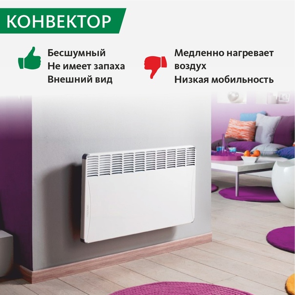 Конвектор работает по принципу циркуляции воздуха – холодный воздух проходит через конвектор, становится горячим от нагревательного элемента, а затем поднимается наверх, что обеспечивает естественную циркуляцию теплых потоков воздуха в помещении.