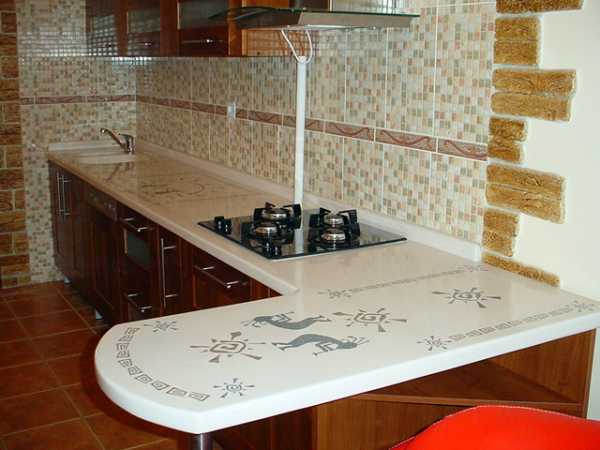 Если площадь кухни позволяет установить барную стойку, то декоративный камень в интерьере будет незаменим. Он даст возможность выполнить этот элемент в любой форме, придаст ему изысканности и необычности.