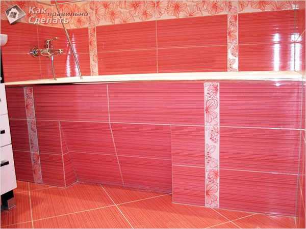 Сделать основу экрана можно практически из любого стройматериала, а затем снаружи отделать ее по вашему вкусу. Для облицовки применяются пластиковые панели или кафельная плитка.