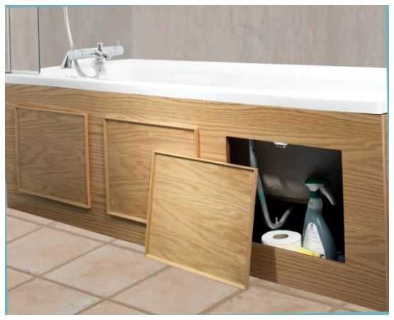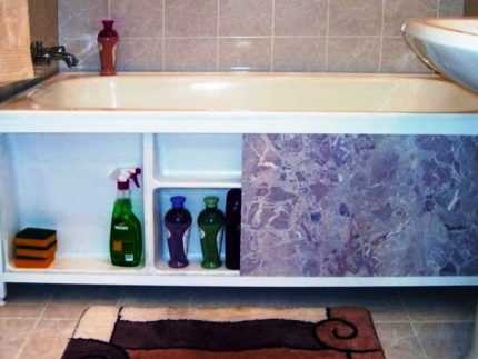 Экран, обеспечивающий доступ под ванную, выполняется с раздвижными дверцами или с вмонтированным шкафчиком для бытовой химии; может иметь вертикально или горизонтально открывающиеся полости. Вертикальные конструкции открывания целесообразно обустроить по принципу жалюзи или оборудовать газовыми подъемниками и прочими креплениями, хорошо знакомыми мебельщикам.
