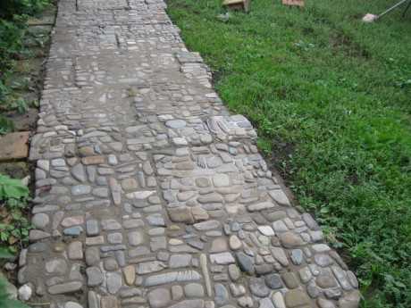 На загородном участке красиво смотрится брусчатка в ландшафтном стиле с использованием речных камней. Простая технология изготовления тротуарной плитки своими руками, доступный состав смеси и природные материалы позволяют воплотить идею у себя на даче.