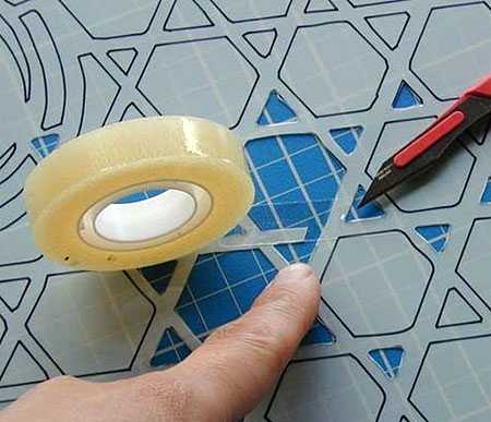 Если Вы случайно порвали один из мостиков вашего самодельного трафарета, то просто заклейте его поверх прозрачным скотчем и прорежьте деталь еще раз. Ничего в этом страшного нет, и порванных деталей шаблона будет много, Вы же не робот, верно?