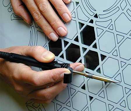 Отверстия в пленке не обязательно вырезать — их можно выплавлять выжигательным аппаратом или паяльником с тонким острым жалом. Изготовленный таким образом шаблон будет не очень аккуратным — края получатся у Вас неровные, с выпуклостями, но делать подобным способом трафарет своими руками проще и быстрее. Не забывайте про метки совмещения! Если Вы используете паяльник или выжигательный аппарат, то подкладывайте под трафарет лист стекла.