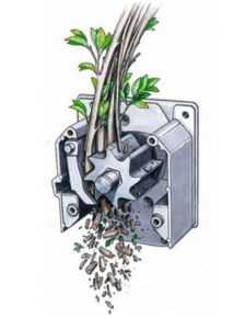 Данный аппарат представляет собой устройство «три в одном». Он позволяет измельчать любые растительные отходы (кроме толстых веток), дробить зерно, нарезать корнеплоды. Свежую траву, пропущенную через аппарат, можно использовать для мульчирования или закладывать в компостную кучу. Измельченные корнеплоды, капустные кочаны и зерно скармливают сельскохозяйственным животным.