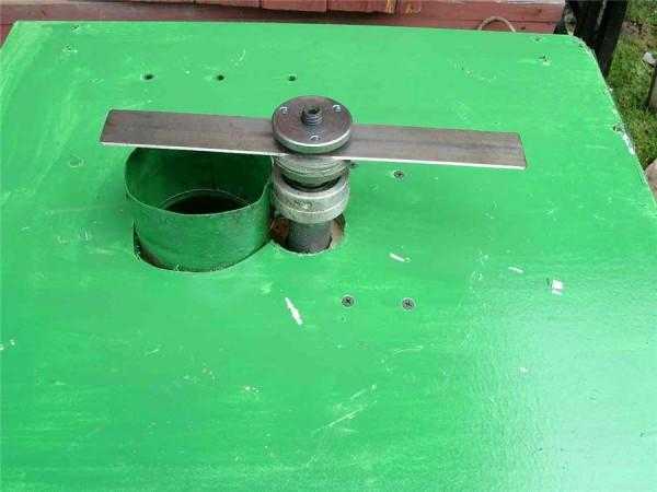 Из двух старых ножовок изготавливают пару ножей и закрепляют их на дне бункера на втулке, выточенной на токарном станке. Длина втулки 40 мм. Чтобы привести ножи в действие, потребуется электродвигатель мощностью 180 Вт, снятый со старой стиральной машины. Шкив электродвигателя закрепляют шпильками под бункером. Ножи фиксируют гайкой М32. Резьбу на втулке нарезают еще во время ее изготовления. Шкив электродвигателя обтачивают болгаркой, делая на нем площадки для фиксации втулки.