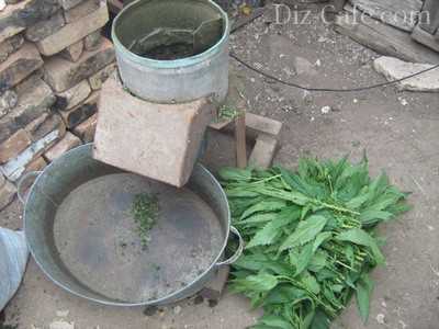 Для удобства работы измельчение сырья лучше выполнять вдвоем. Первый работник осуществляет периодическую загрузку растений, а второй регулирует количество оборотов режущей головки триммера.