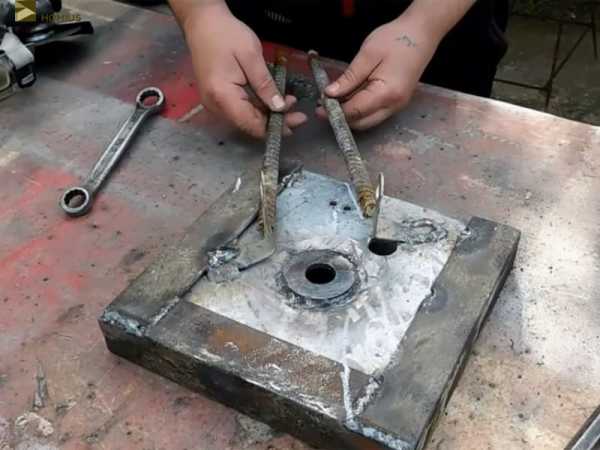 Привариваем проушины для замка, на которых будет зафиксирована болгаркаНо одних проушин будет явно недостаточно. Для того, чтобы измельчать более крупные ветки потребуется фиксация посерьёзнее. Для этого нужно было приварить два отрезка арматуры, которые будут являться как бы продолжением платформы. Их задачей будет крепко «держать» ручку болгарки. Располагаться они должны параллельно проушинам с небольшим сужением, примерно по диагонали квадрата платформы. Наверняка на словах это понять непросто, а потому ниже есть фотопример.