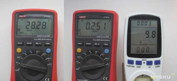 Мощность по постоянному току (чисто светодиодная) Р=28,28В*0,251А=7,1Вт.