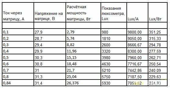 Принцип прост. Я подаю на матрицу ток через калиброванные промежутки (для удобства восприятия) с блока питания, при этом не забываю про напряжение на матрице (т. к. при увеличении тока, хоть и не намного, оно тоже будет увеличиваться) и освещённость. Все данные свёл в таблицу. Остальные данные в таблице – получены путём расчета (перемножением и делением измеренных величин). Это необходимо для получения более наглядных цифр. Ещё раз повторю, показания люксметра сняты для построения графика, не более того.