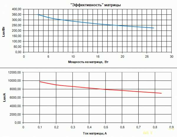 Как видно из графика, чем выше мощность, проходящая через матрицу, тем ниже «энергоэффективность». Если постараться сказать проще, чем меньше мощность от номинала, тем бОльшая мощность переходит в свет, а не в тепло.