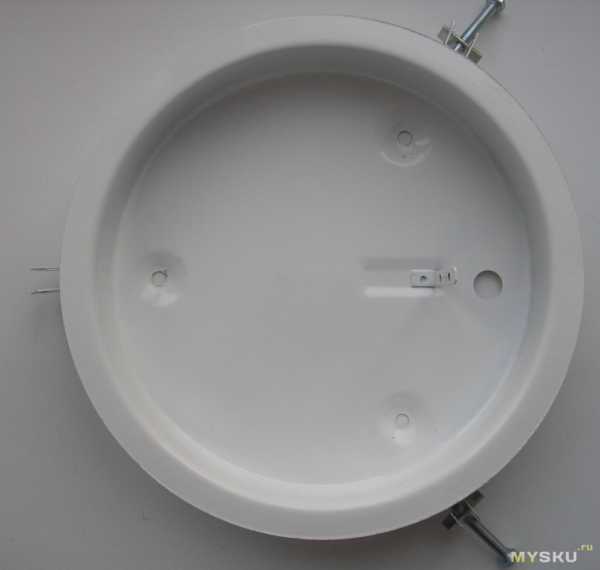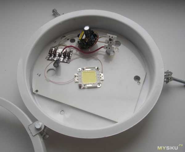 Светодиоды припаяны к тонкой печатной плате, приклеенной к алюминиевой пластине, которая прикручивается к покрытому пластиком дюралюминиевому радиатору с применением термо-пасты.