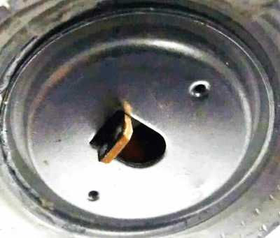 Далее аналогично снимаем цоколь. А вот диск приходится потихоньку выбивать со стороны цоколя, просунув тонкий металлический стержень и уперев его ближе к краю, в ребро диска. Иначе диск будет выгибаться. Только после этого вынимаем плату драйвера. Он построен на аналогичной микросхеме BP9916C в корпусе SOP-8 и представляет собой также неизолированный понижающий преобразователь, позволяющий поддерживать постоянным ток через светодиоды. Схема отличается от предыдущей незначительно, в основном номиналами элементов и их обозначениями на плате, и ещё тем, что после резистора R1, параллельно диодному мосту, установлен керамический конденсатор ёмкостью 0,1 мкФ на напряжение 400 В. Поэтому приводить схему не имеет смысла. Микросхема установлена со стороны печатных проводников. Замкнув контакты неисправного светодиода, удалось восстановить работоспособность лампы. При сопротивлении регулировочных резисторов RS1 и RS2, равных 5,6 и 3,9 Ом, ток через светодиоды равен 130 мА.