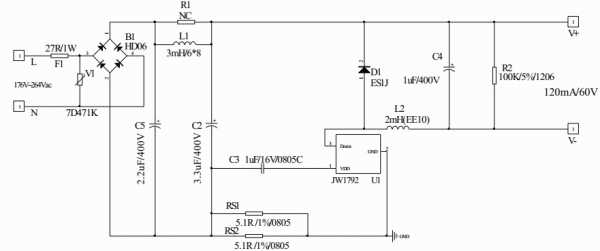 Теперь уже полностью разобрал лампу. Драйвер оказался собран на микросхеме JW1792, которая на первый взгляд выглядит, как транзистор (корпус TO92). Как ни удивительно, это — микросхема понижающего квазирезонансного неизолированного преобразователя. Справочный листок (datasheet) на неё с отметкой «Конфиденциально» нашёлся в Сети довольно просто, в нём приведена типовая схема включения этой микросхемы.