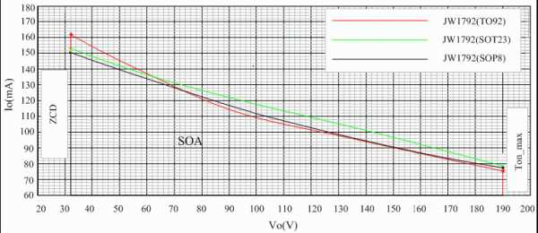 Но вернёмся к вопросу, почему в лампе Эра две цепи светодиодов стоят параллельно, и почему бы все их не соединить последовательно. В справочном листке на микросхему JW1792 есть график, обозначающий область безопасной работы микросхемы (SOA).