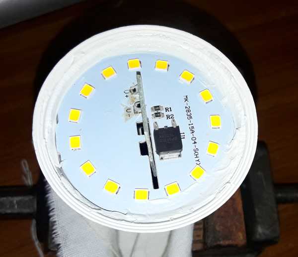 Далее вынимают гибкую плату и отпаивают провода, соединяющие её с цоколем. После этого можно подробно рассмотреть конструкцию лампы. Её внешний вид показан на рис. 6. Материал её корпуса похож на керамику, видимо, чтобы не оплавился при нагреве светодиодов и, возможно, хоть как-то отводил тепло от них. Материал — довольно хрупкий, легко скалывается.