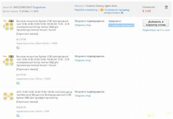 В первом своём обзоре заказал на пробу только одну «светоматку». После её удачного опробования заказал ещё три (10 Вт и две по 100 Вт холодного и тёплого цвета свечения). Заказал в декабре 2016 года. Через месяц пришли. На дворе 2018-ый год.