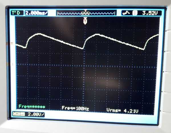 Эти пульсации считать бессмысленно, они слишком малы. В данном случае я ловил пульсации частотой 100 Гц. Это НЕ последствия преобразования, там другая частота порядка нескольких десятком кГц. Это результат сглаживания по входу выпрямителя 220 В «энергосберегайки». Не зря поставил такую ёмкость.