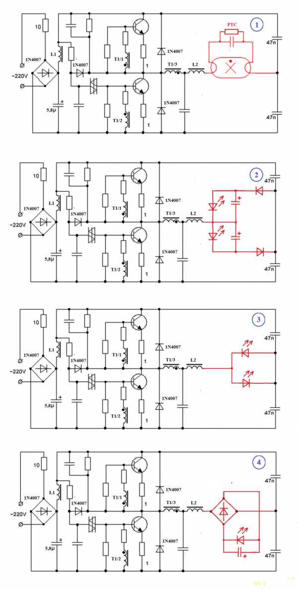 На первом рисунке (схема №1) собственно схема с элементами (красного цвета), которые нужно убрать. На втором, третьем и четвёртом варианты переделки оконечной части под светодиодный драйвер (схема «допилинга»).