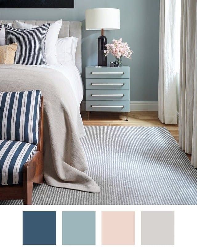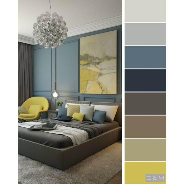Прохладная комбинация серого цвета с синими или голубыми оттенками. Для разбавления обстановки применяются белые стены или аксессуары: одна серая стена, а рядом белая кровать под серым покрывалом с голубой подушкой. Голубые или серые с узорами занавески.