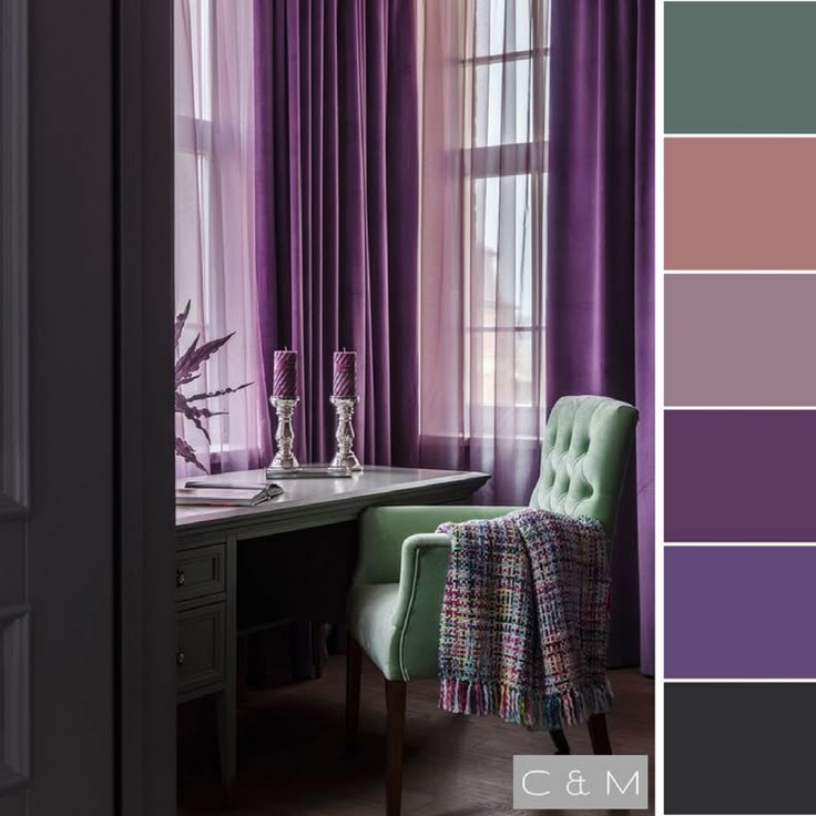 Для спальни стоит выбрать сочетание с приглушёнными фиолетовыми оттенками. Такая комбинация расслабляет и помогает отдохнуть.