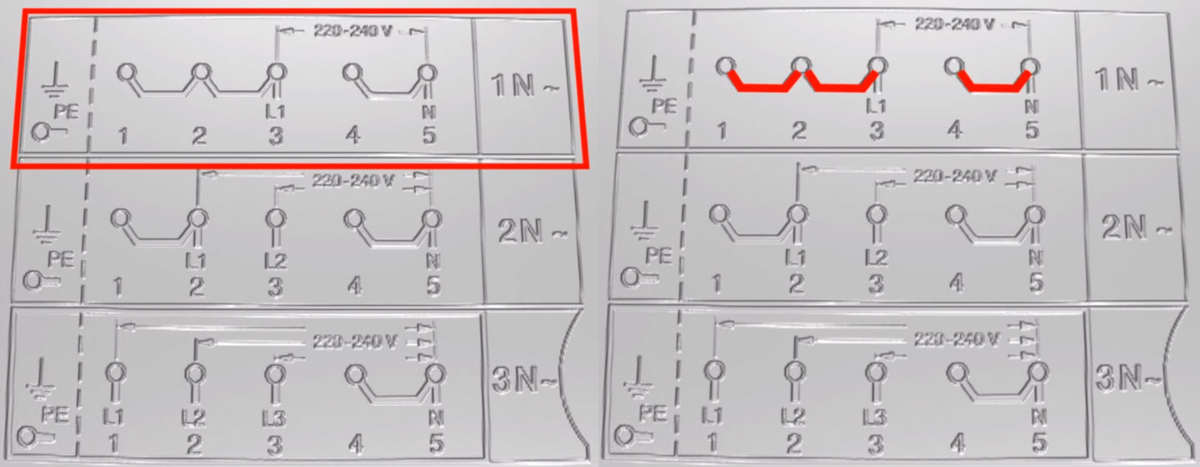 Этот вариант распространен в квартирах. Фазу L одновременно подсоединяют на клеммы L1-3, установив между ними 2 медные перемычки, входящие в комплект варочной панели. N ноль подключают на клеммы N1-2, защиту PE – на PE клемму. Чтобы получить доступ к клеммам, откручивают и снимают заднюю крышку плиты.