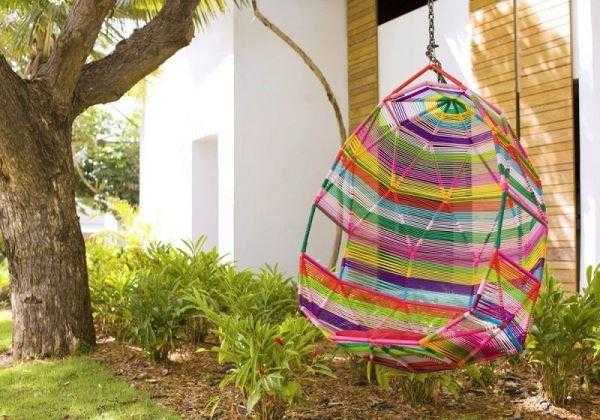 Так как сделать качели на даче могут люди с оригинальным мышлением, то очень подойдёт необычный и интересный вариант. Это изделие с кольцом из прочного металла. Металлическое кольцо крепят горизонтально к опоре, используя четыре цепи. В специальном обруче устраивают из большого количества цепей так называемое гнездо. Эти цепи необходимо прикрепить одним концом по окружности этого обруча, а свободные концы переплетают друг друга, и таким образом, скрепляются. Чтобы цепи не царапали человека, их обматывают плотной и мягкой тканью, а в само гнездо кладут специальную подушку.
