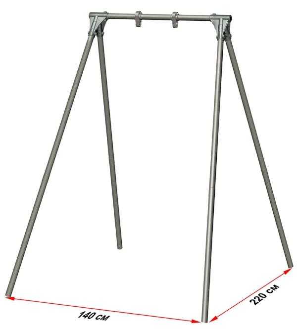 Дачные качели в форме буквы П состоят из двух вертикальных столбов и одной перекладины между ними. Ее можно приварить или прикрепить болтами с контргайками. Уже соединенные между собой опорные части также вкапывают в землю и заливают бетоном. Дополнительную устойчивость им придадут два уголка с прутьями, уходящими вниз на 1 метр, где тоже будут забетонированы или залиты цементом.