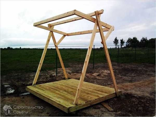 Само сооружение устанавливается непосредственно в грунт. Достаточно выкопать яму до 80 см глубины. На дне делаете подушку из щебня на 20 см, вставляете стойки и заливаете их бетоном. Чтобы предотвратить гниение деревянных стоек в бетоне, их можно изолировать или обработать специальным средством против гниения.
