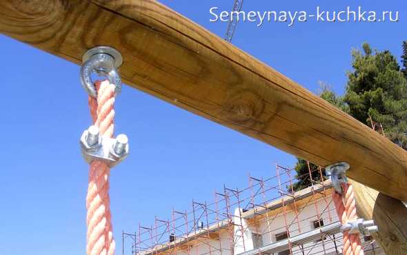 А если конец лежащего бруса не достаточно длинный для того, чтобы там уместить еще одни дополнительные качелей – то можно прикрутить к нему вот такую веревочную лестницу – или просто канат.