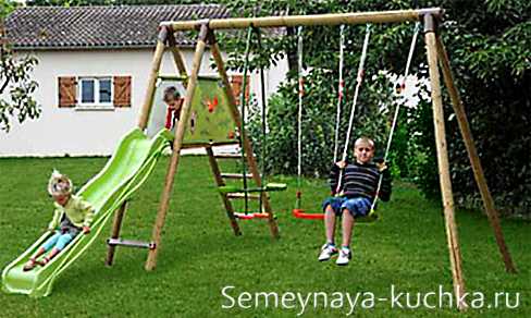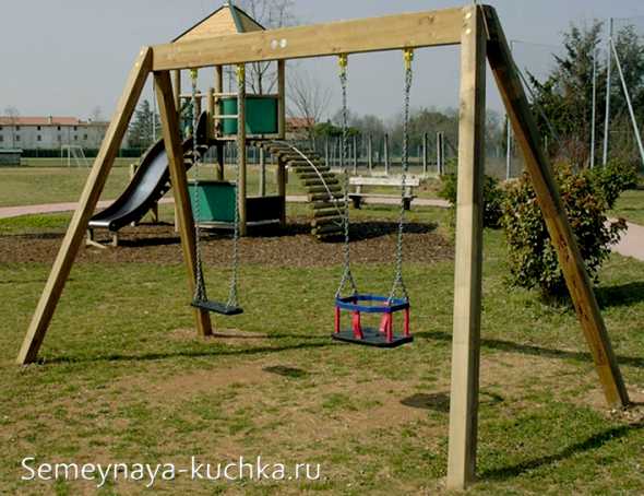 Именно таких моделей качелей чаще всего можно встретить на приусадебных участках – устойчивая А-конструкция.