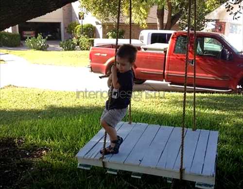 Наиболее простой из всех возможных способов создания садовых качелей своими руками – качели из грузовой паллеты (поддона). Для такой модели нужны только поддон, веревки и, конечно же, место для подвешивания: толстая горизонтальная ветка дерева, балка на открытой веранде или крепкая опора на столбах.