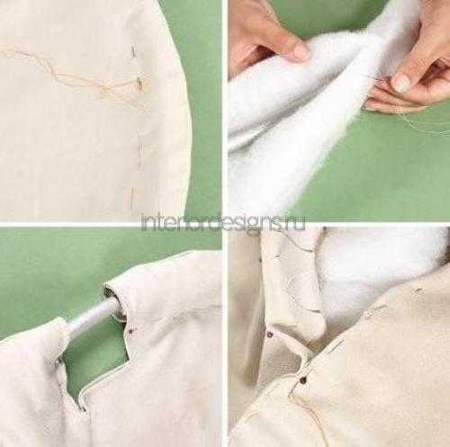 Между тканевыми кругами лучше вложить слой синтепона, им же обмотать и сам круг. Можно обойтись, конечно, и без этого, но времени и денег на этом экономится немного, а вот в комфорте потеряется в разы. Теперь осталось только сшить круги ткани между собой и закрепить чехол на обруче.