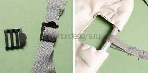 В прорези продеваются стропы, и закрепляются сверху в общее кольцо для удобства подвешивания. Длину строп и, соответственно, положение качелей, можно регулировать по желанию и настроению.