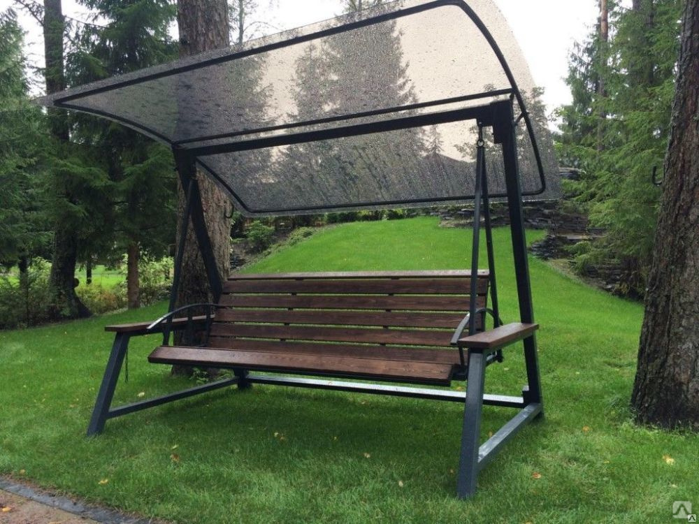 Металлическое кресло-качель с козырьком из профнастила- защищает от солнечных лучей;