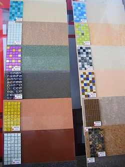 Напольная плиткаНапольная плитка обычно производится из керамики или природного камня. Керамическая плитка может быть глазурированной и неглазурированной. Мозаика выкладывается различными методами. Плитка на полу кладётся, как правило, на клей, состоящий из песка, цемента и иногда латексной присадки для дополнительной прочности. Межплиточные швы (промежутки между плитками) как правило заполняются специальными составами — затирками.