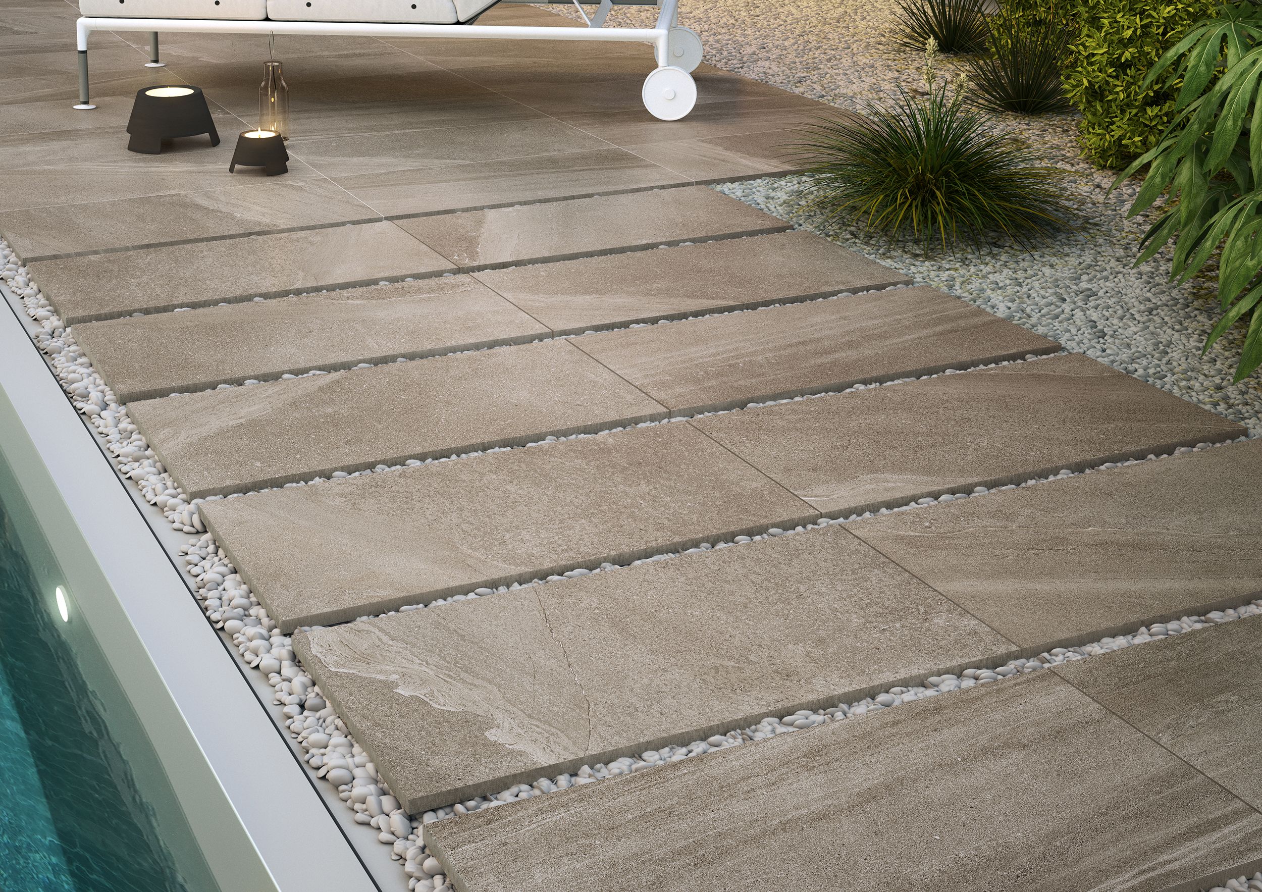Третий этап: сделать сухую раскладку (достать материал из всех коробок и разложить его по всей площади основания, включая ступени, при этом миксуя-перемешивая плитки и ступени так, чтобы тональность или напечатанный рисунок не совпадал с соседнем элементом). Таким образом, мы получаем возможность вносить корректировку раскладки для достижения уникальности и неповторимости в дизайне, что, в свою очередь, придаст эстетическую визуальную составляющую всего объекта. Если получившийся рисунок устраивает, тогда переходим к следующему этапу.