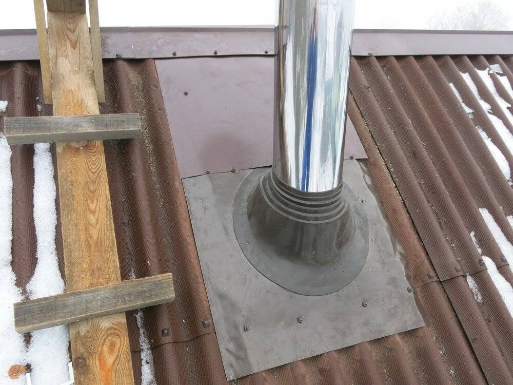 Особенно сложно разобраться новичкам, как вывести трубу на крышу, ведь это, пожалуй, самый сложный этап работы. Ведь конструкцию нужно не просто вынести из комнаты, это нужно сделать правильно. В этом вам поможет специальный элемент под названием срез крыши. Именно его нужно использовать для вывода трубы. Кровельная разделка — металлическая конструкция, не позволяющая трубе соприкасаться с кровельным материалом и остальными слоями кровельного пирога, предохраняя их от перегрева. При покупке этого элемента важно учитывать уклон вашей крыши. Стандартные изделия помогут вывести трубу на крышу, имеющую уклон 15-35˚ или 35-55˚.