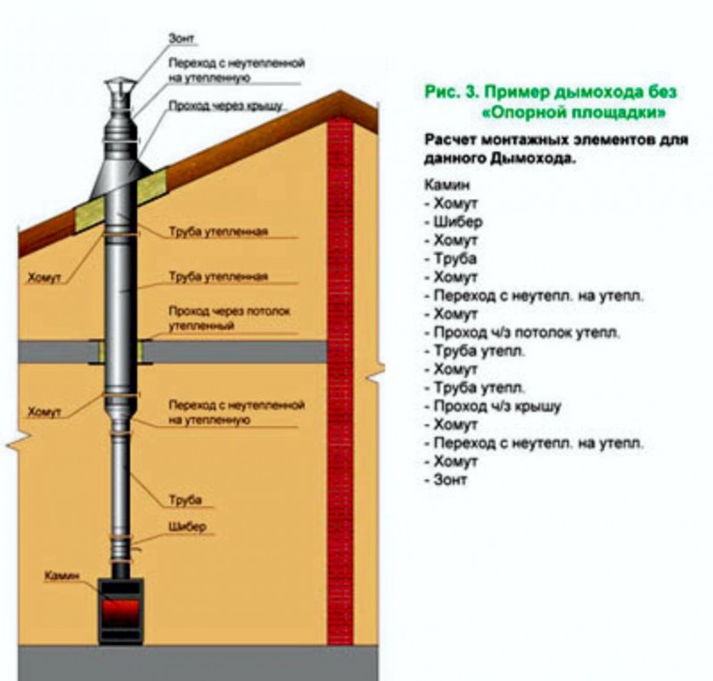 Над перехлестом делается разрез. Для этого нужно установить специальное звено дымохода в виде металлического короба, внутри которого есть отверстие, либо это может быть сквозная труба. Такой срез должен быть на 7 см больше толщины перекрытия. Служит для предотвращения воспламенения горючего потолка как снизу, так и сверху. Далее труба монтируется уже известным вам способом.