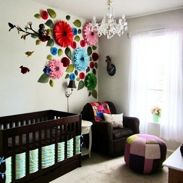Декор стен из бумагиНаиболее оригинальный декор стены своими руками можно выполнить с использованием бумажных аппликаций. Это могут быть как смелые бумажные цветы, так и любые другие фигуры.