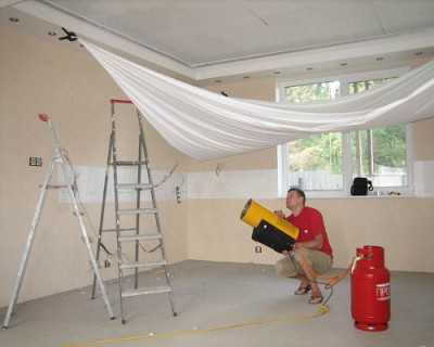 - Полотно подвешивают на веревках к углам помещения и нагревают до 60-70 ℃. Для нагрева используют тепловую пушку. При такой температуре поливинилхлоридная пленка становится эластичной и мягкой.