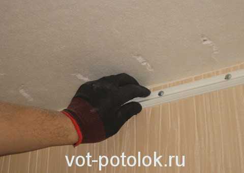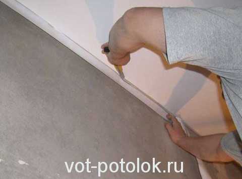 - Монтаж каркаса начинают с установки профиля или багета по всему периметру как верхнего, так и нижнего уровней. Багет крепят на стены шурупами в подготовленные заранее при помощи перфоратора отверстия. Таким образом, формируют жесткий каркас, по всему периметру потолка, который будет удерживать полотно ПВХ.