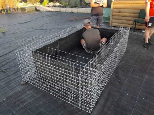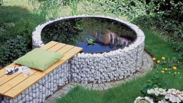 Маленький бассейн или искусственный пруд будет хорошо смотреться в обрамлении габиона