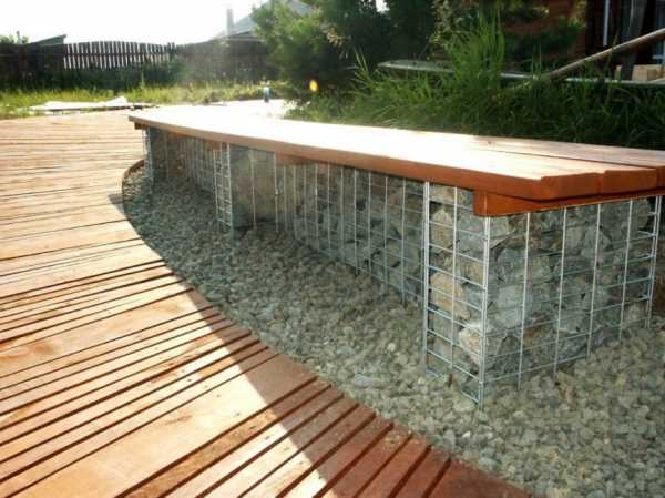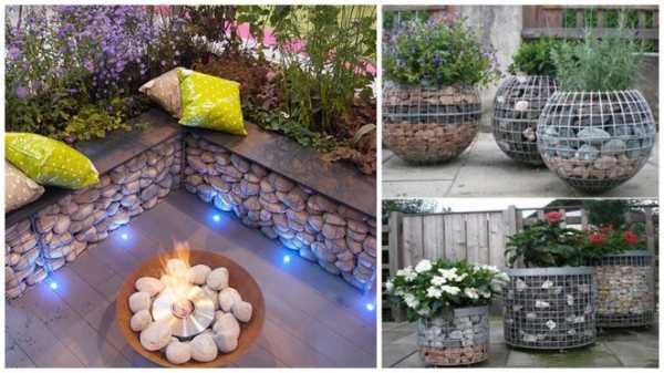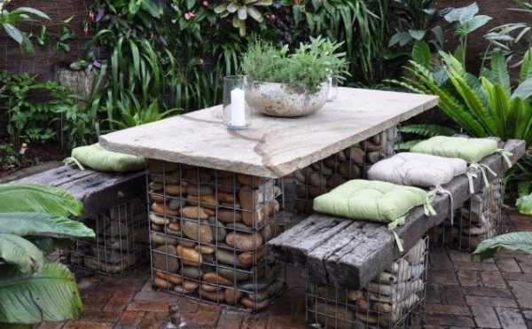 Попробуйте соорудить уголок для отдыха, используя габионы. Например, большие каркасы, которые будут исполнять роль стола, заполните крупными камнями, а вокруг соорудите каркасы поменьше, для стульев.