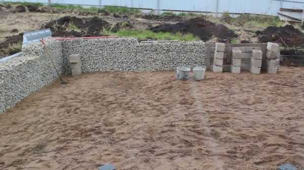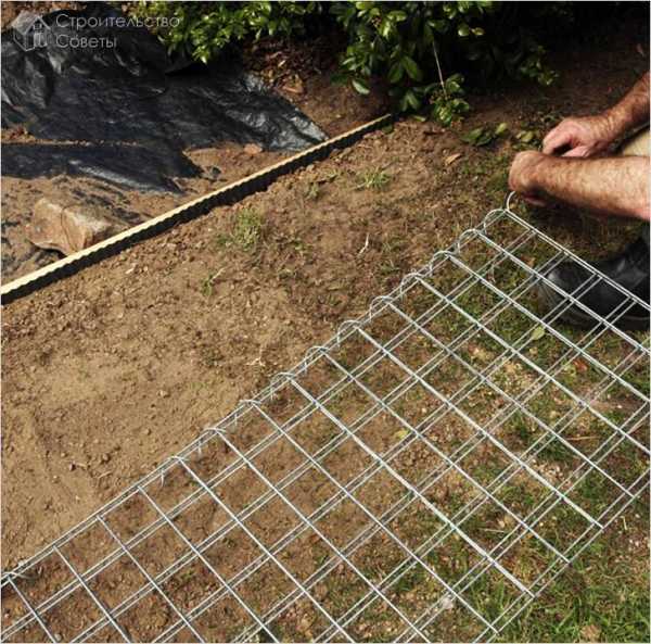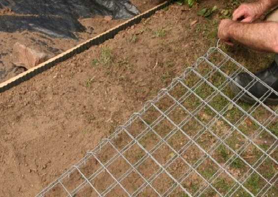 Перед установкой каркаса следует подготовить почву. Для начала выкопайте траншею под габион глубиной 15 см. Затем сделайте песчано-гравийную подушку. Чтобы сорняк не пророс и не испортил габион, да и во избежание прямого контакта металла с землей, нужно провести гидроизоляцию основания.